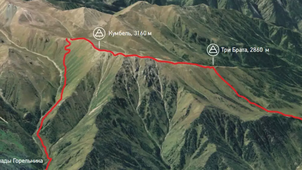 На Кумбель - маршрут 114. Теперь с вершины нужно выбрать наиболее северный гребень, который спустит вас в ущелье Горельника, в километре выше домика метеостанции Верхний Горельник. Сначала с вершины идет средней сложности спуск через разрушенные скалы, но вскоре появится альпийская зелень и отчетливо видимая тропа, идущая строго по гребню. Поход займет 9-10 часов. Маршрут достаточно сложный, требуется подготовка.