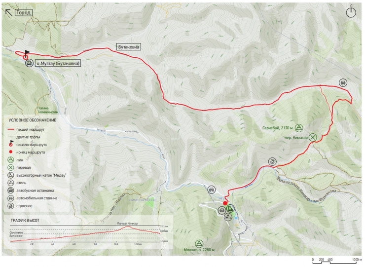 Этот маршрут является обратным маршруту 104. От остановки надо пройти поселение Бутаковка по асфальтовой дороге примерно 40-45 минут до конца асфальта и далее до шлагбаума. До этого места можно подъехать и на машине, если вы выберите радиальный путь, дойти только до перевала Кимасар (Кимасаровский или Комиссаровский перевал, 2100 м) и вернуться обратно.