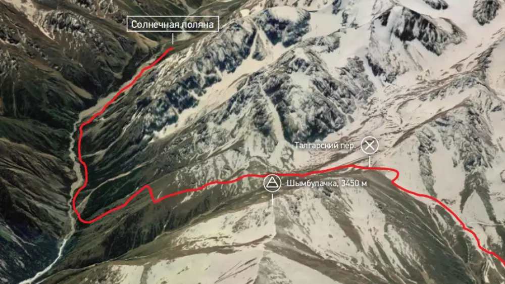 Начало маршрута с ГЛК "Шымбулак", Большой Талгарский перевал (3200 м) по маршруту 123 до перевала Талгарский. Далее тропа разветвляется на юго-запад (ледник Богдановича, перевалы Абая, Пионер, Комсомол, вершины Школьник, Абая, Букреева/Пионер, Учитель, Нурсултан (Комсомол), Карлытау и др.) и на север. Наш путь - в северном направлении вниз.