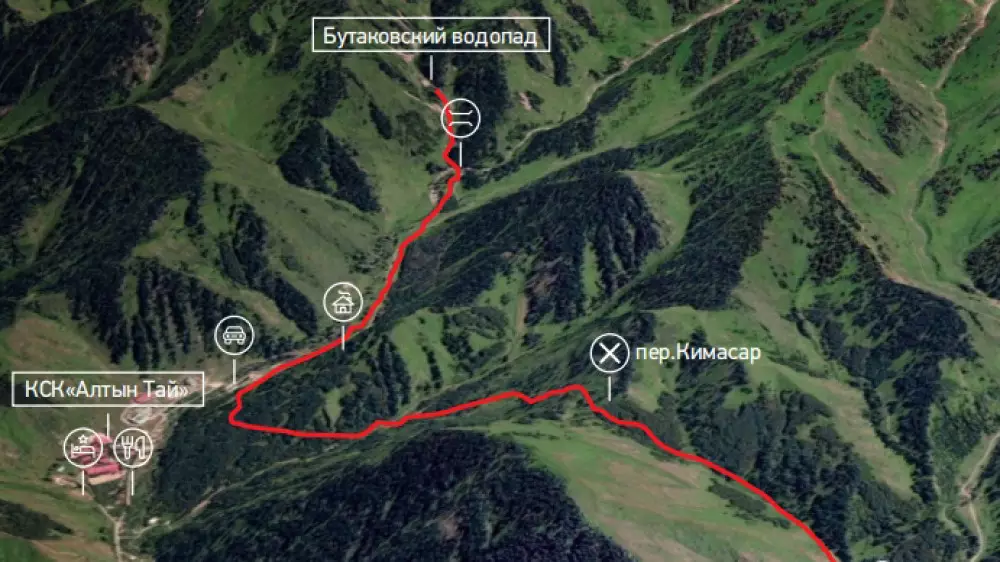 От Медеу идем по маршруту 104 в восточном направлении. Тропа выходит в Бутаковское ущелье выше спорткомплекса. По ущелью ведет проселочная дорога, по которой продолжается путь на юг. Медленный подъем через 30 минут приводит к берегу речки, текущей параллельно дороге, которая переходит в тропу. Тропа поднимается вверх по долине, пересекает ручей и выходит на широкое луговое поле. Правый берег Бутаковки хорошо просматривается на протяжении полукилометра с тропы, идущей по левому берегу. К концу поляны ущелье сильно сужается. В узком месте находится турбаза "Экстрим" - филиал горнолыжного комплекса "Табаган". Тропа раздваивается: одна идет вверх по ущелью, а наш путь лежит по тропе, которая ответвляется в боковое ущелье налево.