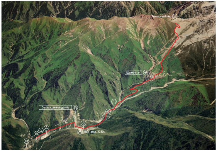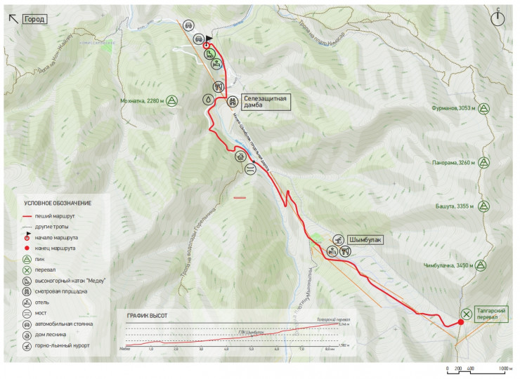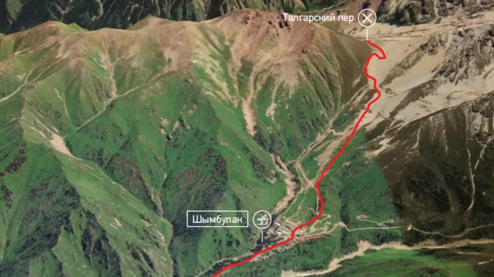 Начало маршрута указано в описаниях "Медеу" - водопады Горельника (109). От Горельника идем дальше по асфальтированной дороге до горнолыжно-спортивного комплекса "Шымбулак". Это примерно час ходьбы. Высота - 2200 м. Здесь можно отдохнуть. Далее наш путь проходит рядом с канатной дорогой. Можно подняться на перевал на канатке, если она работает и у вас нет желания идти пешком. Если же вы решили подняться пешком на перевал, то запаситесь водой. Предстоит долгий и крутой подъем вдоль канатки по грунтовой дороге.