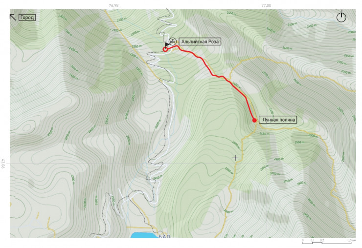 От верхней площадки центра вверх уходит хорошая тропа, которая прямо выходит на широкую поляну - Лунную поляну (43.06762, 76.99974). От Лунной поляны разветвляются несколько троп в восточном и западном направлениях. Это другие маршруты, которые будут описаны в следующих разделах.